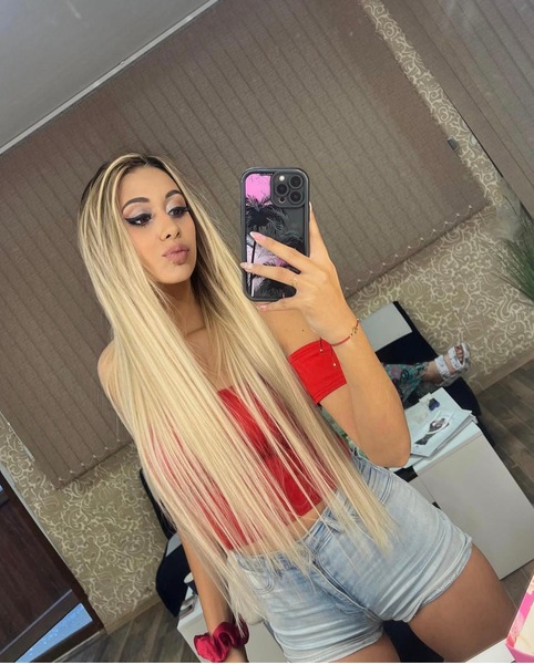 Haare:blond, rückenlang, glatt