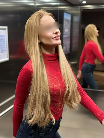 Haare:blond, rückenlang, glatt